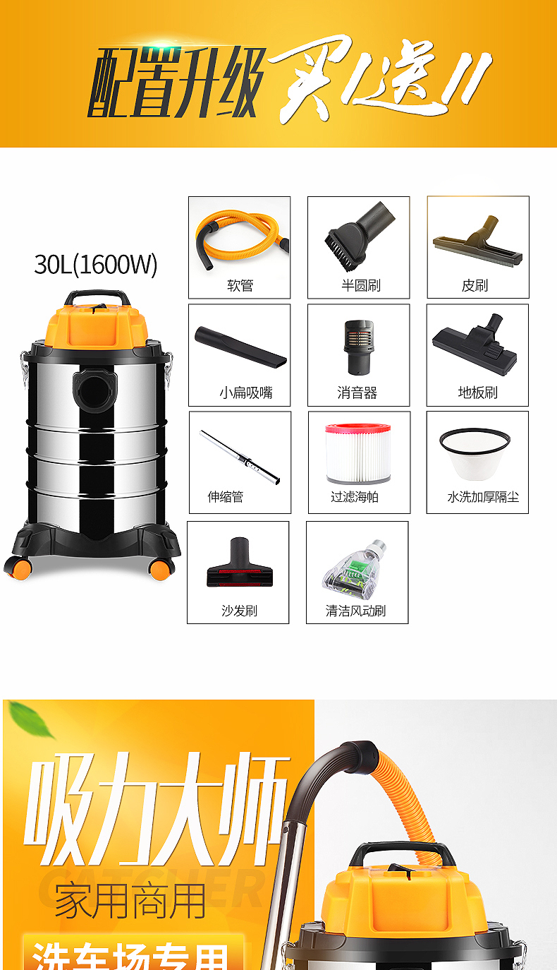 志高(CHIGO)1600 W商用掃除機の大出力大吸力家庭用洗車ドライヤ3用掃除機30 L ZG-X 308 B(30 L)